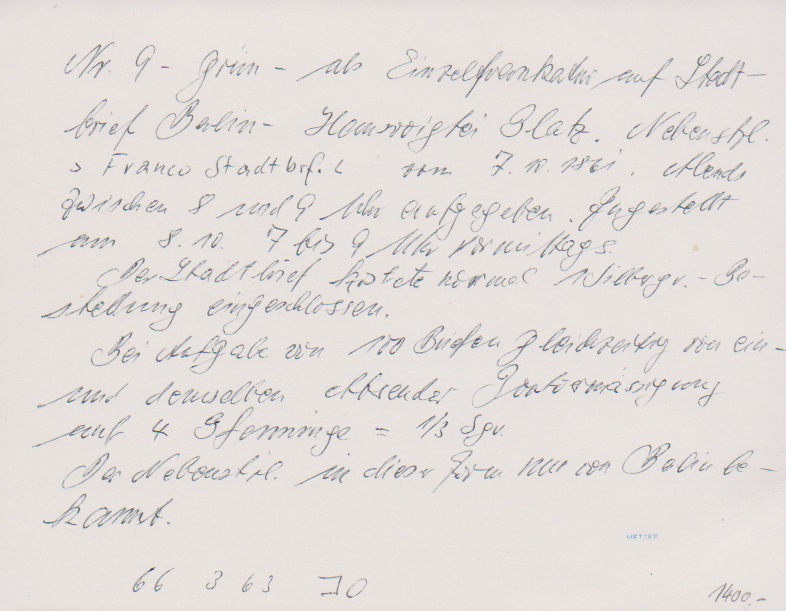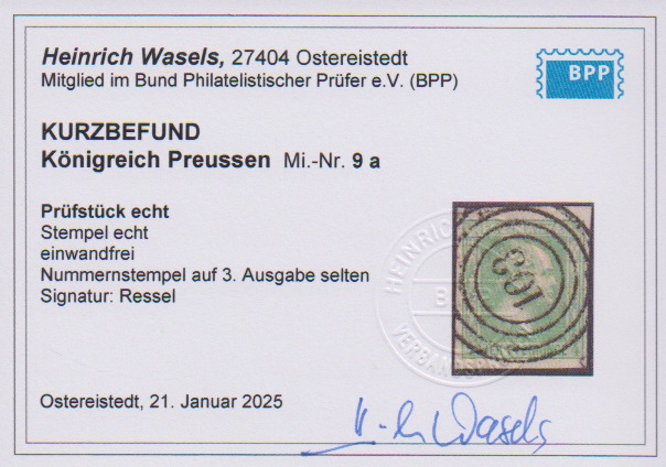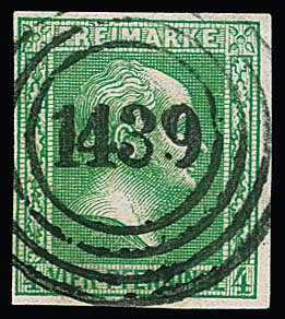 4 Pfge. gelblichgrün, Kabinettstück mit klarem NS "1439" (Stettin), auf der Nr. 9 nicht häufig. Mi. 200,-