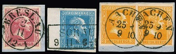 1 Sgr. karmin auf Luxusbriefstück mit K2 "Breslau", 2 Sgr. blau zweimal lose (einmal v. Rand mit Reihenzahl), sowie 3 Sgr. orange im Paar auf Luxusbriefstück mit K1 "Aachen" (sign. Pfenninger)