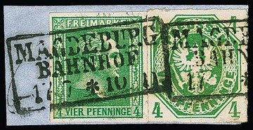 4 Pfge. grün in seltener farb- und wertgleicher Mischfrankatur mit Wappen 4 Pfge. grün (etwas Scherentrennung) auf Briefstück mit Ra3 "Magdeburg Bahnhof"