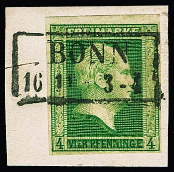 4 Pfge. grün auf Luxusbriefstück mit geradem Ra2 "Bonn", sign. Ressel