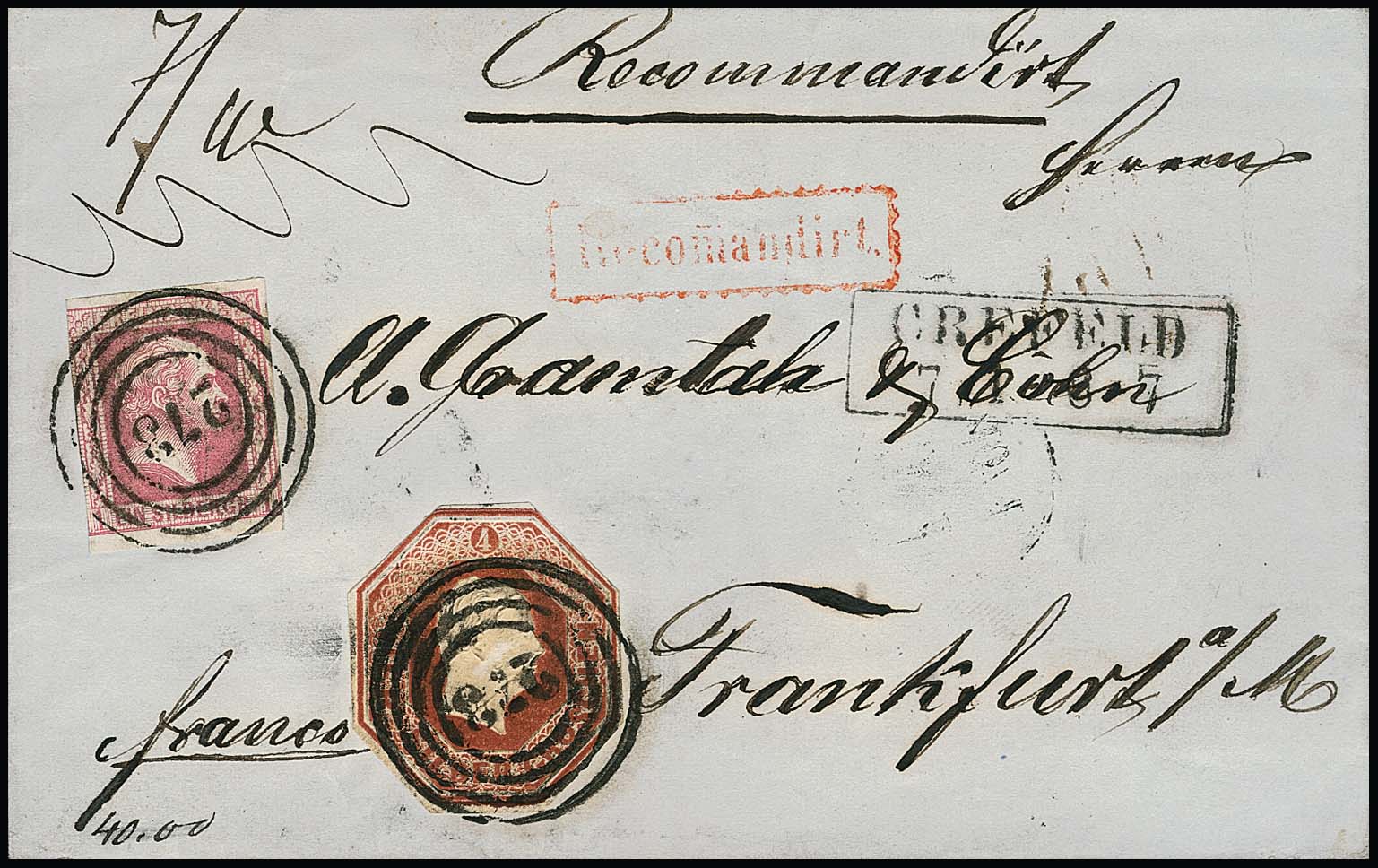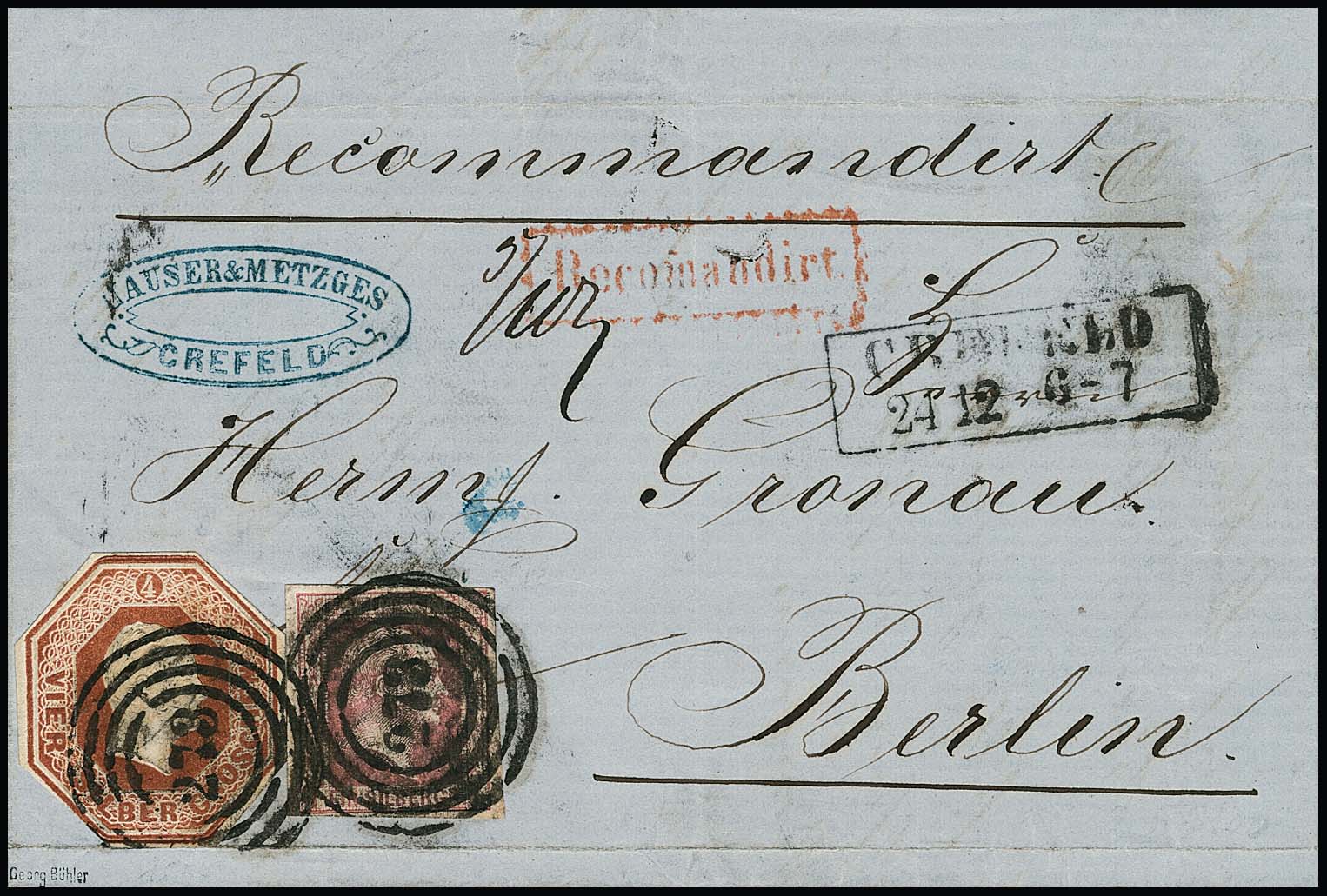 Zwei Briefe von verschiedenen Absendern (einmal Beckerath + Heilmann, einmal Hauser + Metzges) je von Crefeld, 24.12.1857 und 7.1.1858, als Einschreiben nach Frankfurt bzw. Berlin, je frankiert mit 1 Sgr. rosa und achteckig geschnittenem Oktogon-Ganzsachen-Ausschnitt 4 Sgr. rotbraun, also von Seiten des Postbeamten zum Aufbrauch verklebte Oktogon-Ausschnitte. Seltenes Brief-Paar (Mi. 2400,- +) in ursprünglicher Erhaltung