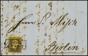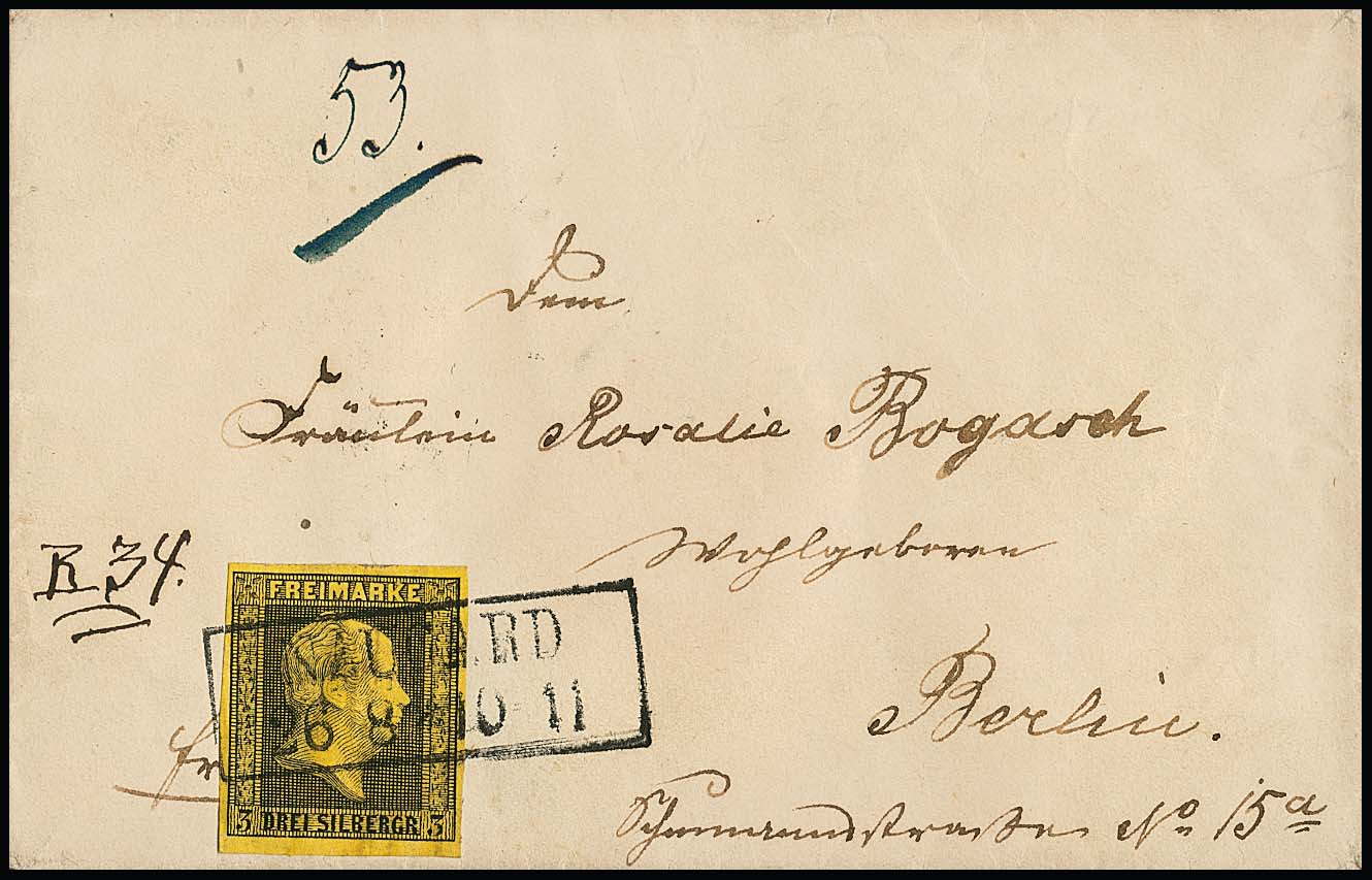 3 Sgr. schw./maisgelb, allseits noch voll- bis breitrandig, auf Prachtbriefstück mit besserer Ortsstempel-Entwertung durch Ra3 "Magdeburg Bahnhof"