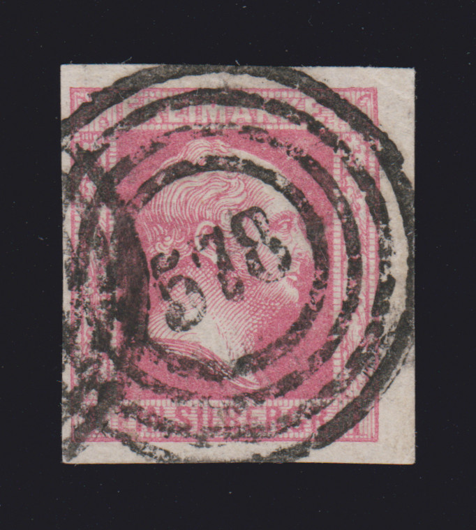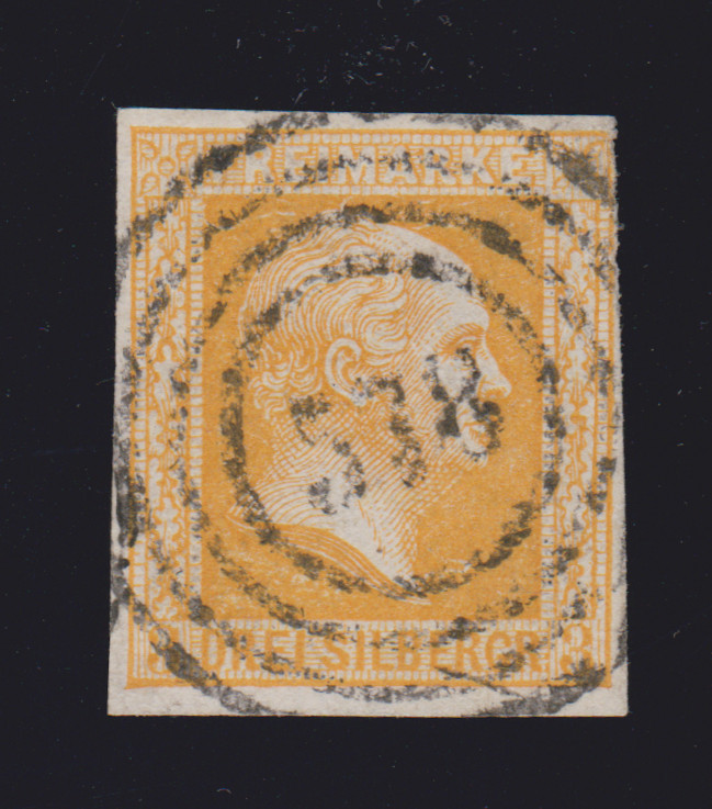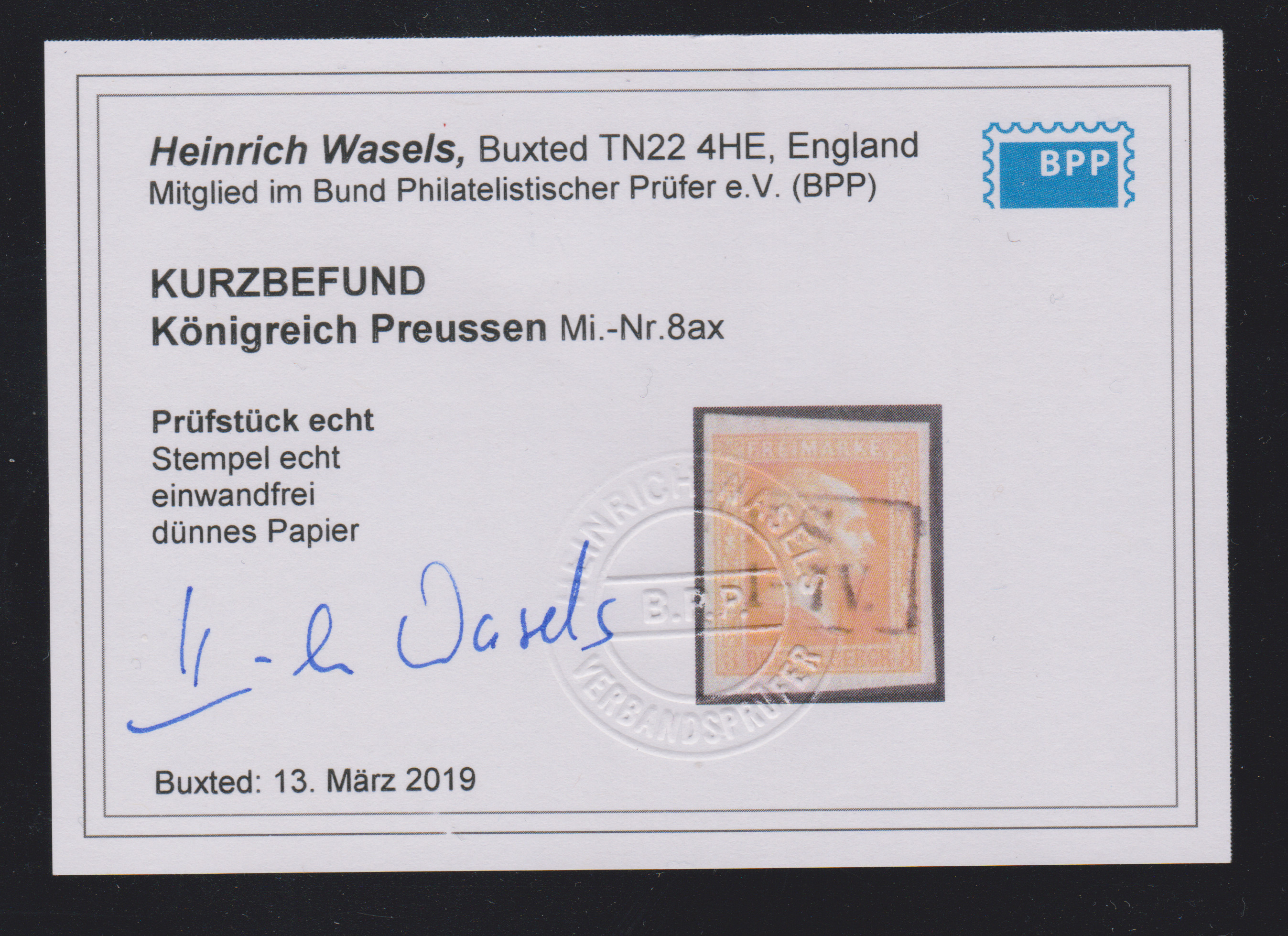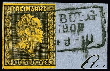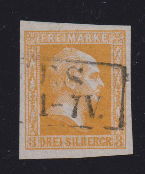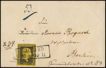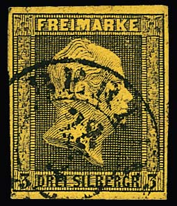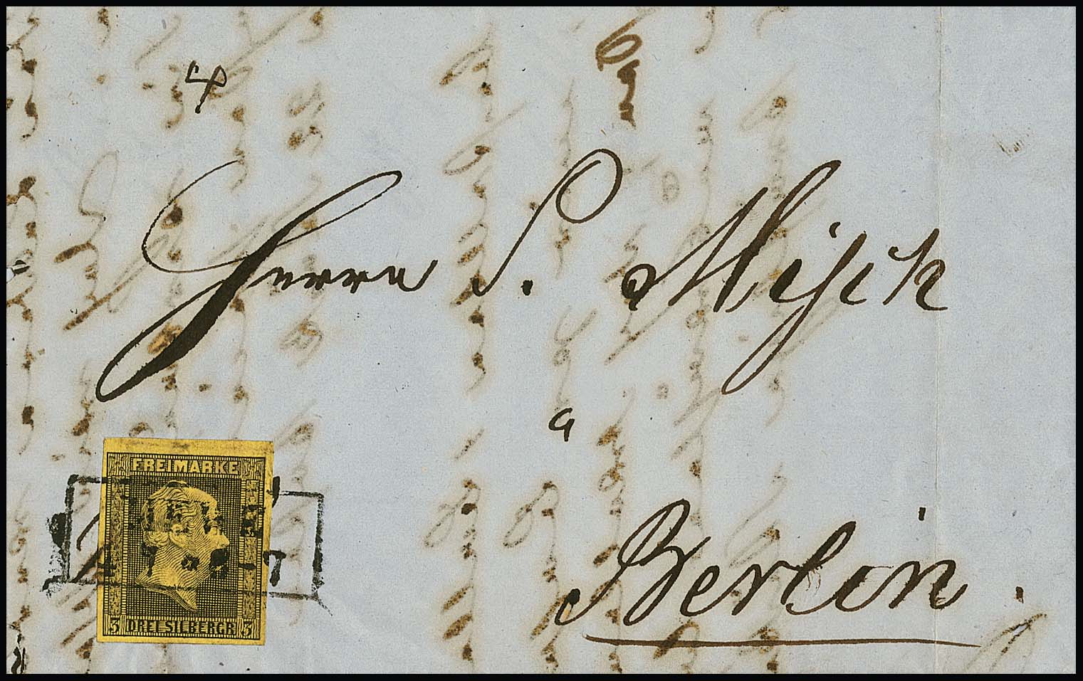 3 Sgr. schw./goldgelb (unauffällige Bugspur) mit ungewöhnlicher Kombination von sowohl kopfstehendem Wasserzeichen als auch Ortsstempel-Entwertung durch K2 "Berlin", sign. Banker