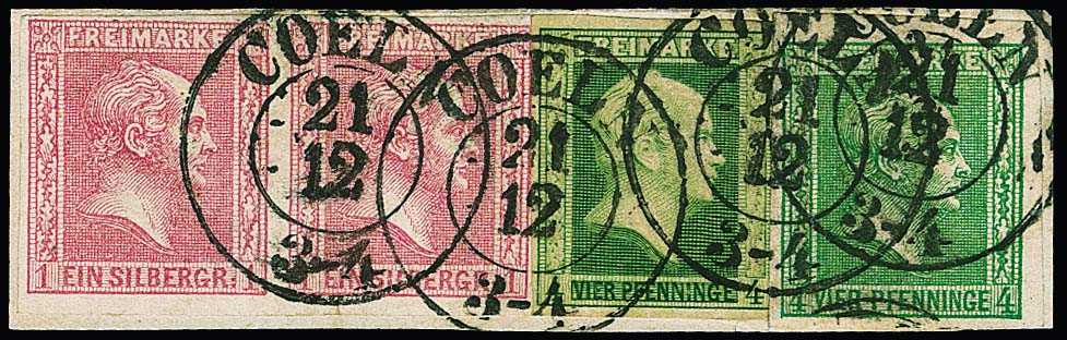 4 Pfge. grün in seltener wertgleicher Mischfrankatur mit nächste Ausgabe 4 Pfge. grün (Bugspur) sowie Paar 1 Sgr. rosa auf Briefstück mit K2 "Coeln". Aus der Baldus-Sammlung