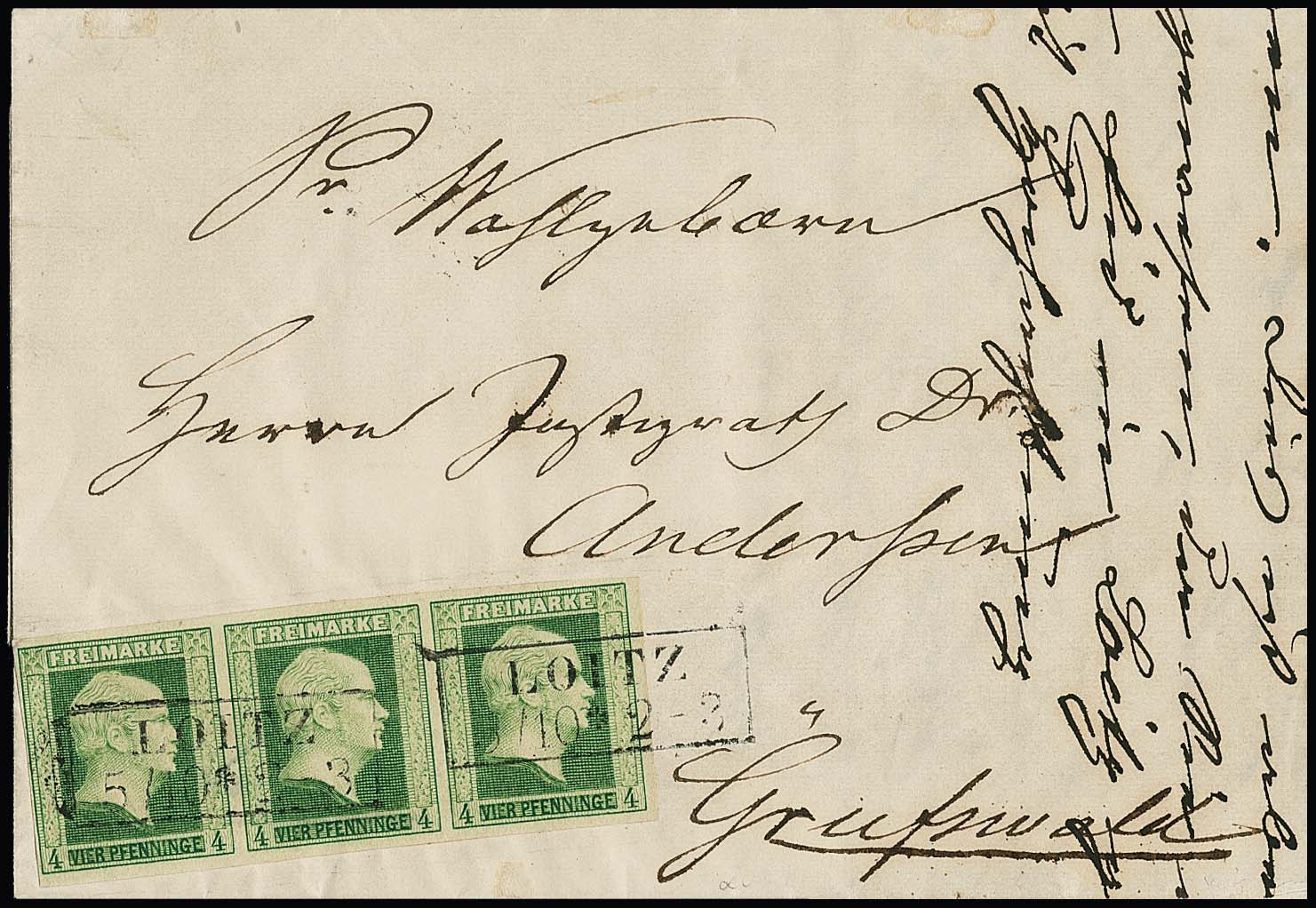 4 Pfge. grün, teils breitrandiger Kabinett-Dreierstreifen mit Ra2 "Loitz" auf Brief nach Greifswald, siehe Foto. Ex Metzer, sign. Kruschel, Banker