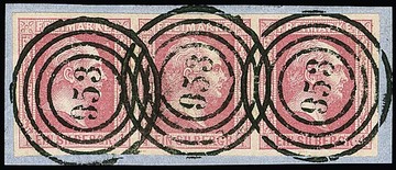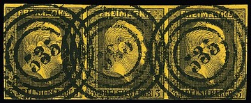 3 Sgr. schw./gelb, Pracht-Dreierstreifen mit NS "535" (Greifswald), sign. Banker. Mi. 150,-