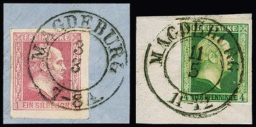 4 Pfge. grün und 1 Sgr. rosa (offensichtlich rechte untere Bogenecke, sign. Kastaun), zwei Kabinettbriefstücke mit K2 "Magdeburg"