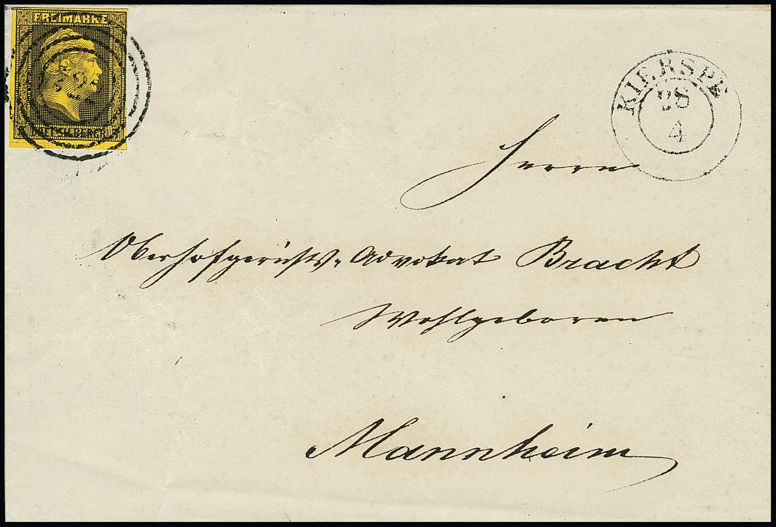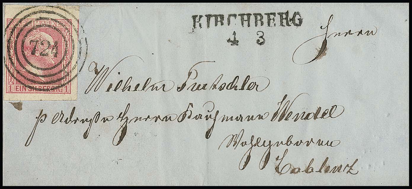 "724" nebst L2 "Kirchberg" auf Brief mit Oberrandstück 1 Sgr. Gittergrund (bereits mit unauffälliger Vorfaltspur aufgeklebt)