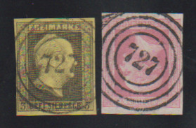 "727" (Kirn) klar auf zwei Prachtstücken 3 Sgr. schw./gelb und 1 Sgr. rosa