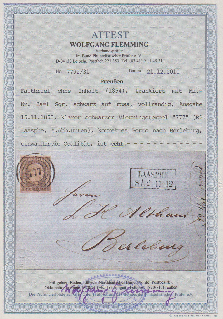"777" nebst Ra2 "Laasphe" klar auf Kabinettbrief 1 Sgr., Attest Flemming