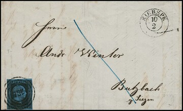 "722" nebst Ra2 "Kierspe" klar auf drei Briefen erste Ausgabe 1, 2 und 3 Sgr., dabei aufgrund der Markenfarbe der Brief 1 Sgr. wahrscheinlich vom 16.11.1850 (hierfür typische Rötel-Taxierung). Eine Fotoexp. Flemming