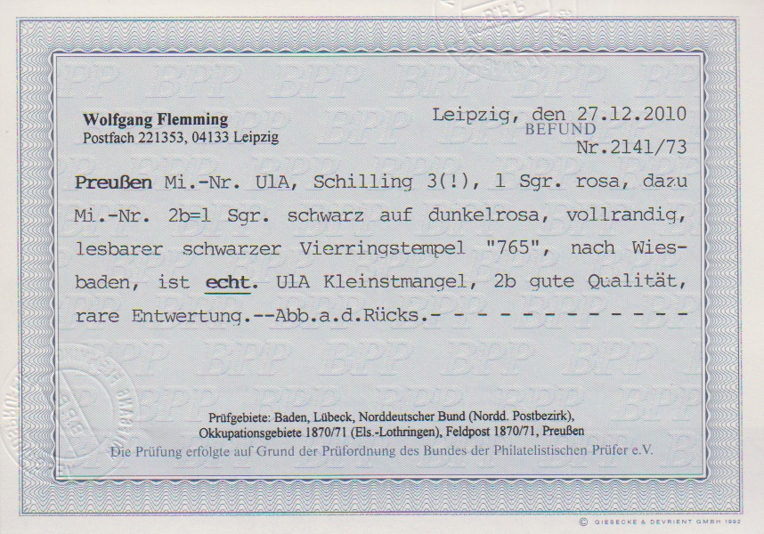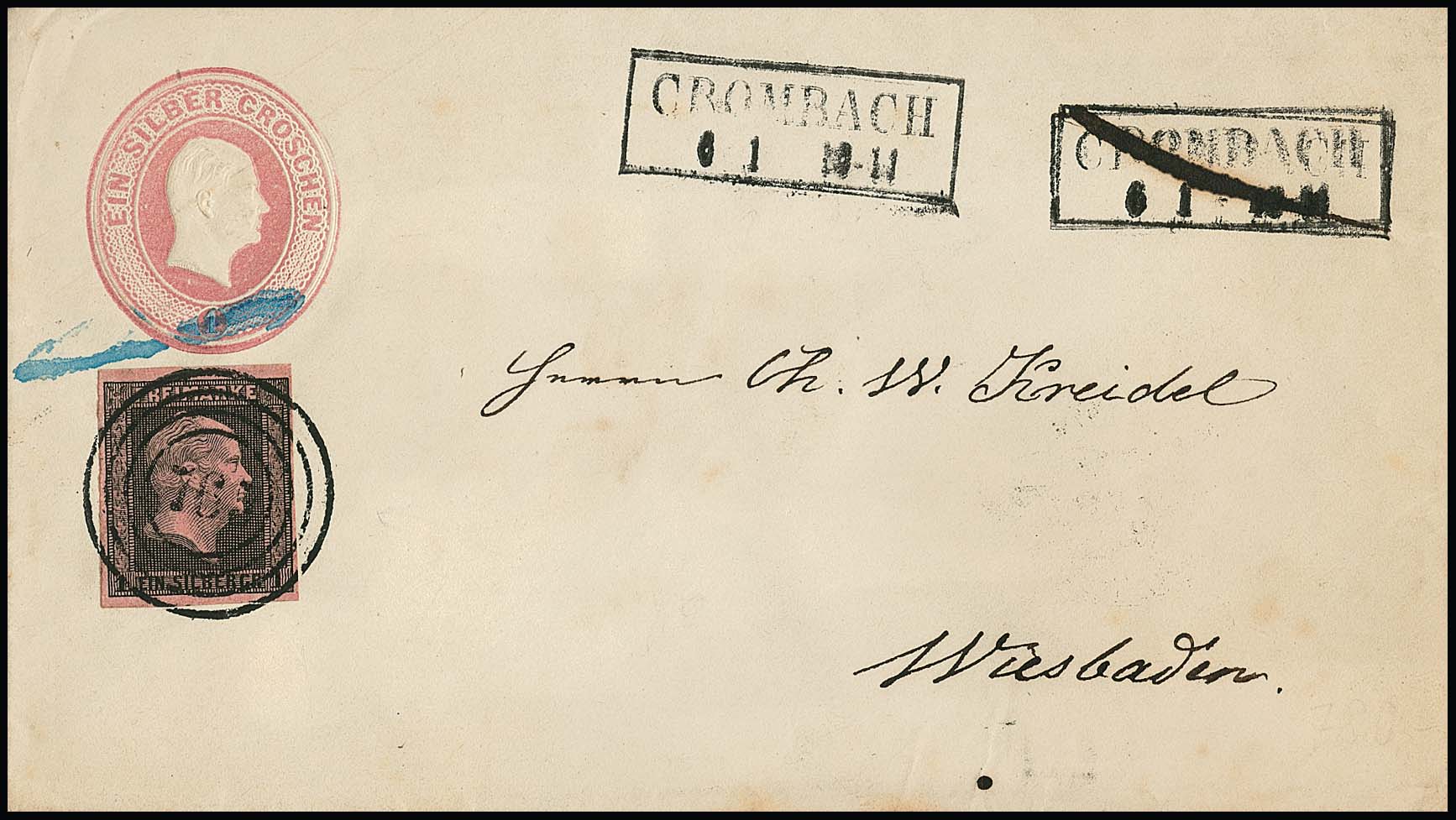 "765" nebst zweifachem Ra2 "Crombach" (einmal gestrichen) auf Ganzsache 1 Sgr. rosa (leichte Gebrauchsspuren) mit Zusatzfrankatur 1 Sgr. schw./dunkelrosa, Fotoexp. Flemming