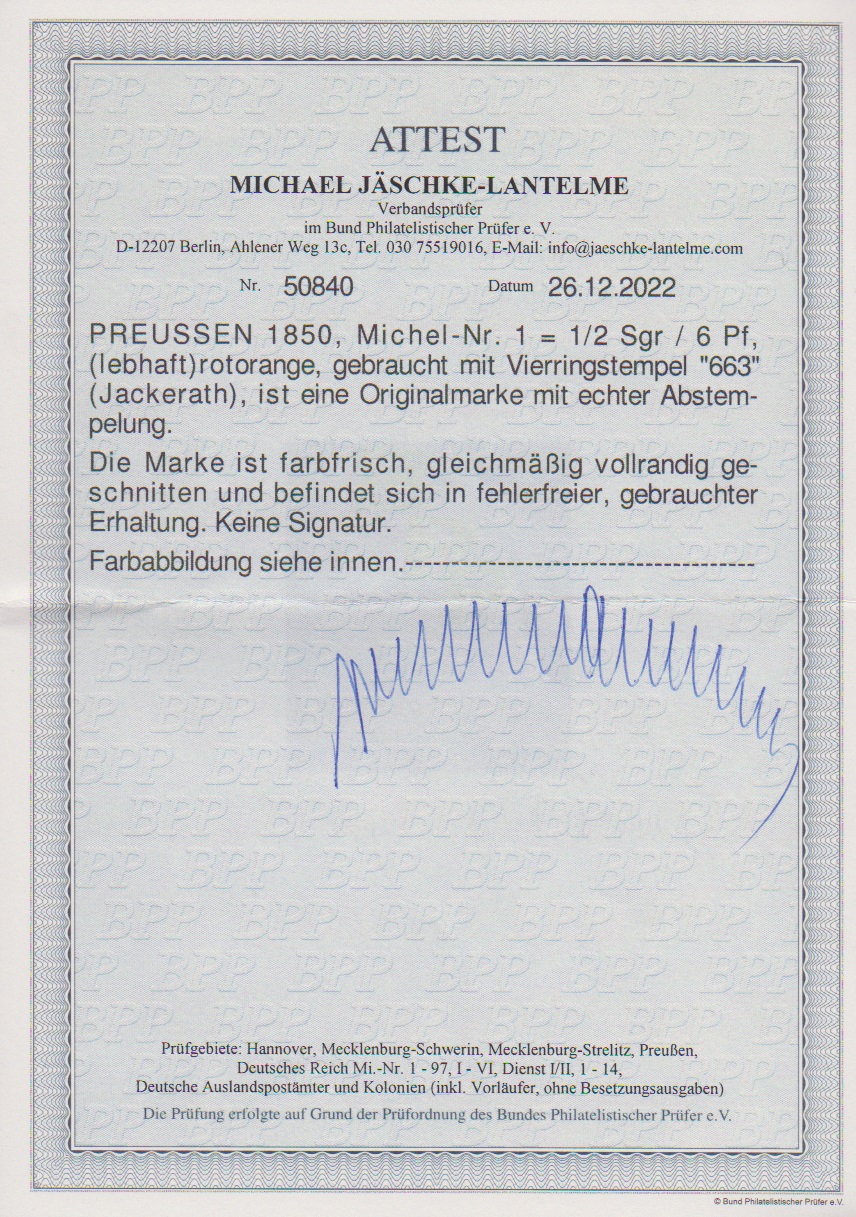 "663" (Jackerath) klar und zentrisch auf Kabinettstück 1/2 Sgr. rotorange, seltener Rheinland-NS, Attest Jäschke-L.