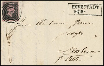 "632" nebst Ra2 "Hovestadt" klar auf Kabinettbrief 1 Sgr., obwohl ohne Inhalt, eindeutig lilarosa Nuance. Auf Brief seltener Westfalen-NS!