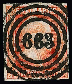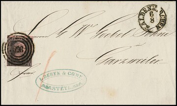 "573" (Bahnpost Halle) in rot, nebst schwarzem L2 "Naumburg", auf frischem Post-Insinuations-Dokument aus Januar 1851 mit zwei gut gerandeten 3 Sgr. (linke Marke von Faltung getroffen). Es sind nur zwei Ganzstücke mit dem roten NS "573" bekannt, das vorliegende stammt aus der Boker-Sammlung. Nummernstempel-Rarität. Sign. Banker und Attest Wasels
