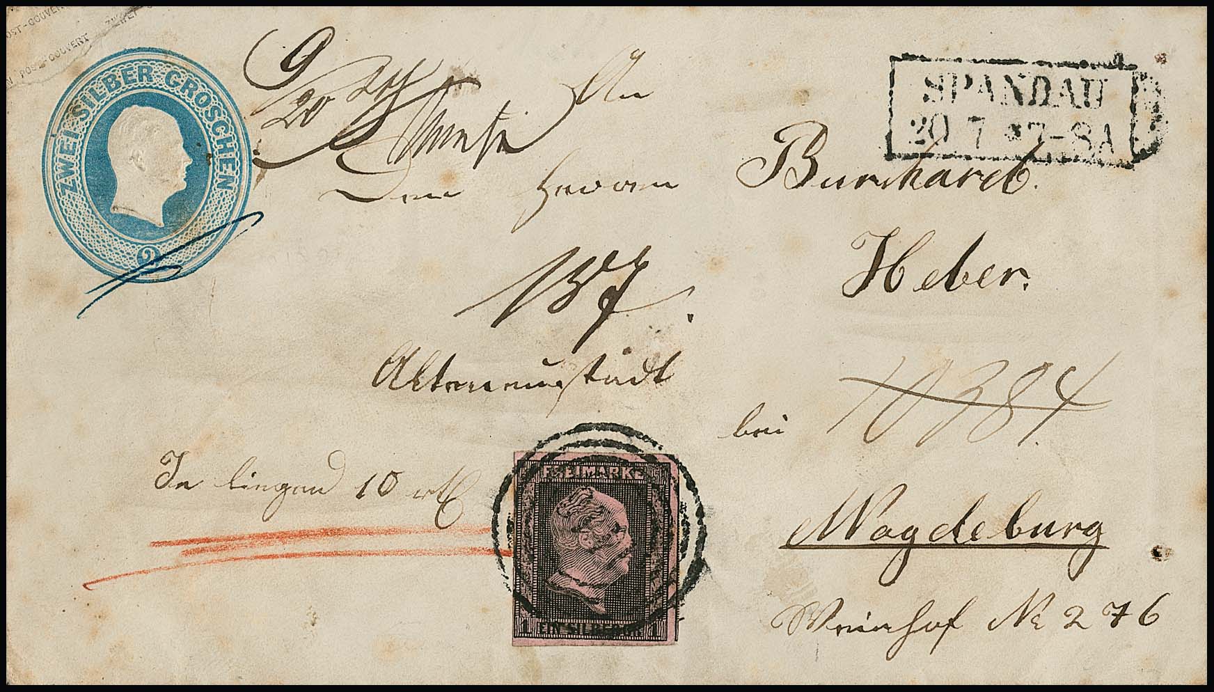 "1416" nebst Ra2 "Spandau" auf Ganzsache 2 Sgr. hellblau (kl. Mgl.), mit Prachtstück 1 Sgr. schw./rosa als Wertbrief nach Magdeburg