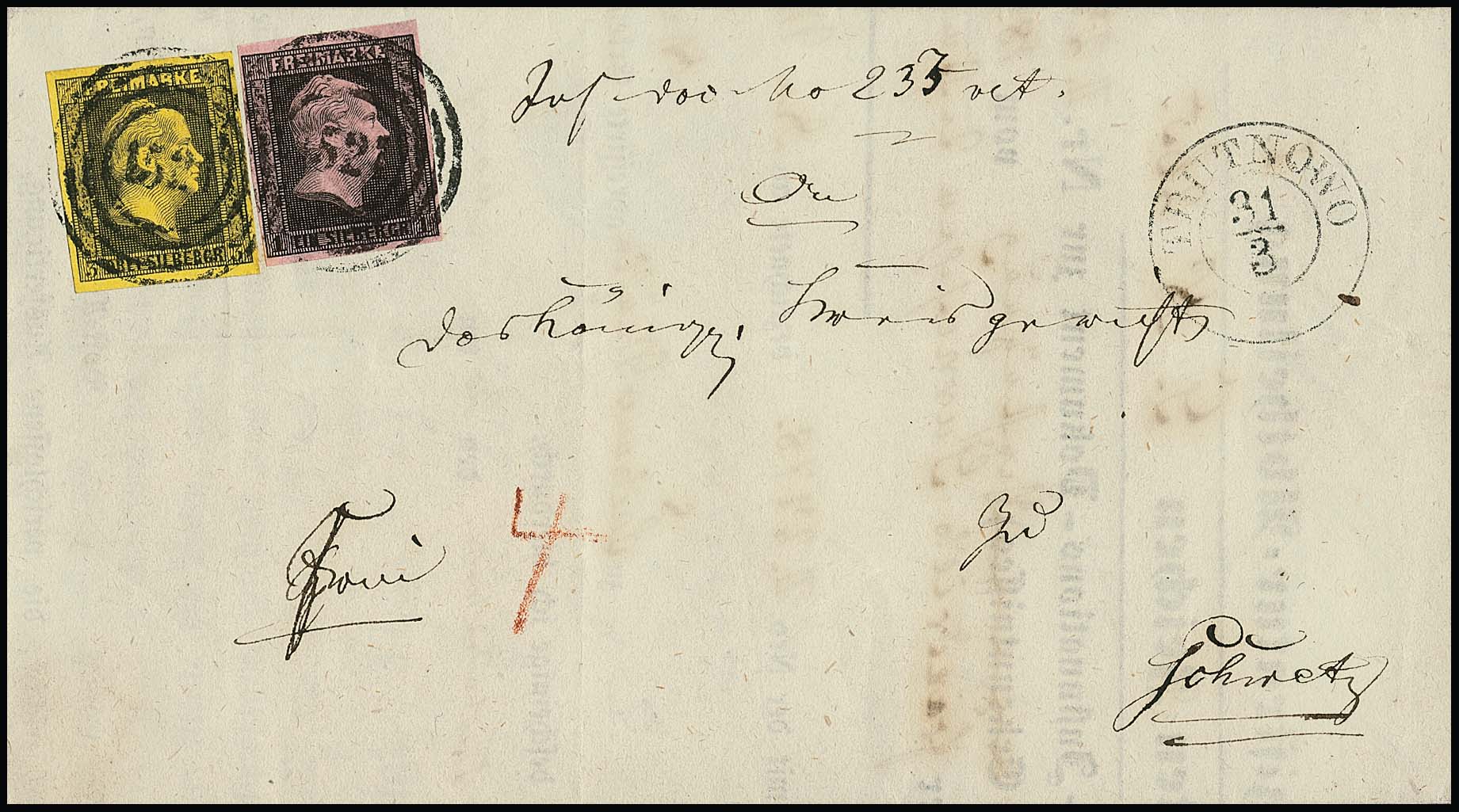 "1521" nebst vorphil. K2 "Trutnowo" auf Post-Ins.-Doc. (vom 31.3.1851) mit tadellosen 1 Sgr. schw./lilarosa und 3 Sgr. schw./gelb