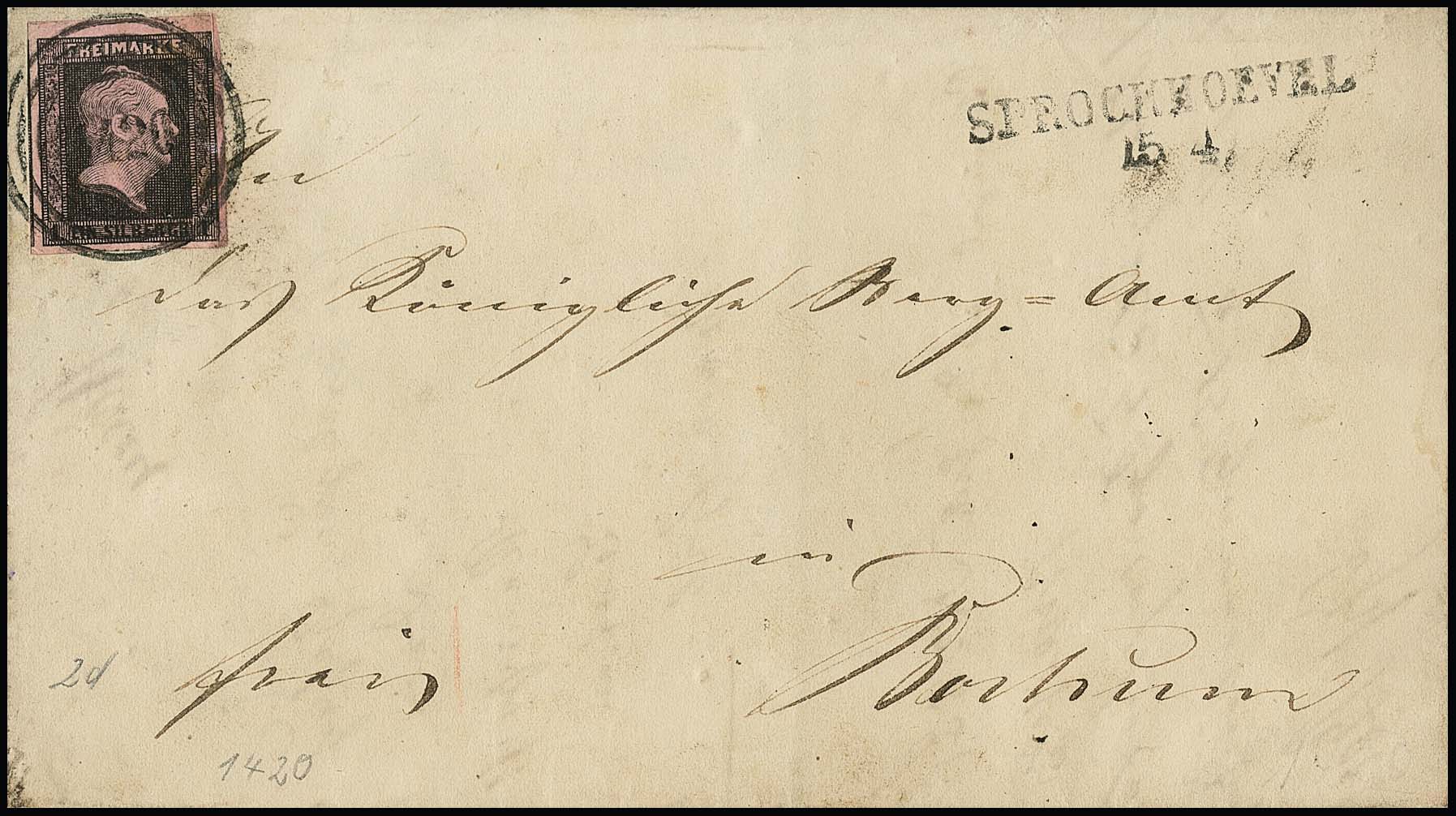 "1420" nebst L2 "Sprockhoevel" auf Brief mit 1 Sgr., trotz kleiner und unauffälliger Mängel auf Brief ein seltener Westfalen-NS!