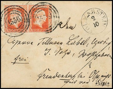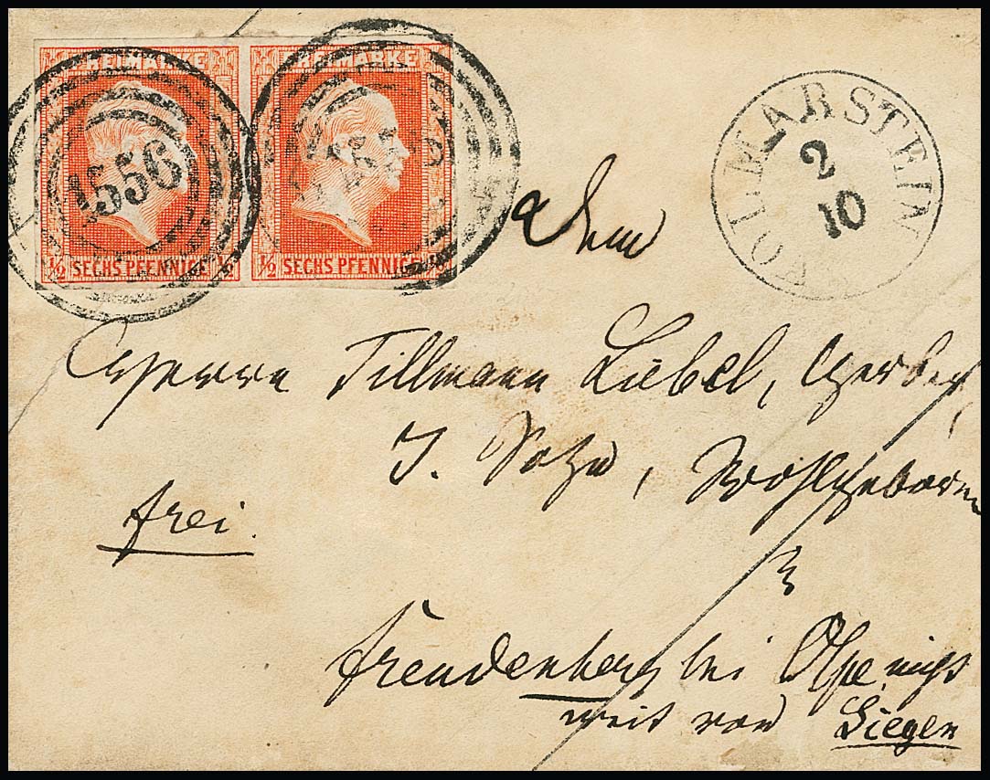 "1556" nebst K1 "Vormarstein" auf Prachtbriefchen mit Paar 1/2 Sgr. ziegelrot