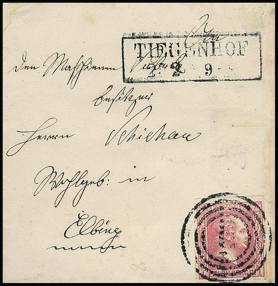 "1498" zart nebst Ra2 "Tiegenhof" auf quadratisch gefaltetem Brief 1859 mit Prachtstück 1 Sgr. Gittergrund, Feuser + 300,-