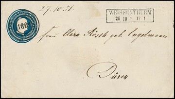 "1601" nebst Ra2 "Weissenthurm" klar auf Kabinett-Ganzsache 2 Sgr. blau. Auf Ganzstück, zumal auf Ganzsache, seltener Nummernstempel der OPD Koblenz