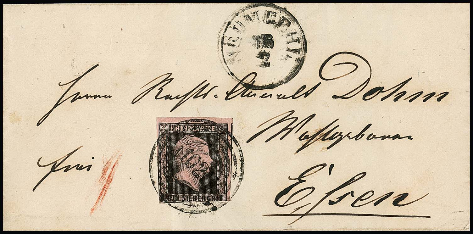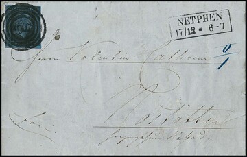 "1002" nebst Ra2 "Netphen" klar auf Brief (Gebrauchserhaltung, Marke bereits mit Bugspur aufgeklebt) mit gut gerandeter 2 Sgr., auf Brief sehr seltener Westfalen-NS, Feuser + 2000,-