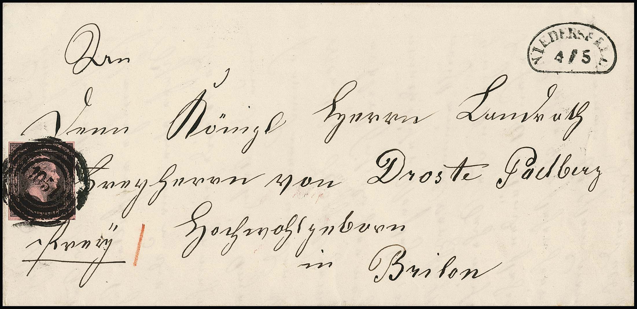 "1051" nebst Nierenstempel (!) "Niedersfeld" klar auf Brief (ohne seitliche Klappen, belanglos) mit Kabinettstück 1 Sgr., auf Ganzstück äusserst seltener Westfalen-NS, Feuser + 1800,-