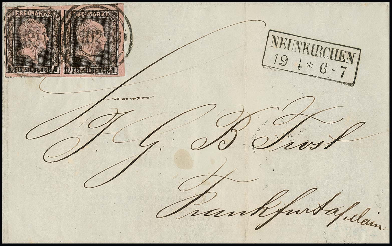 "1021" nebst Ra2 "Neunkirchen" klar auf mittig gef. Brief mit Kabinettpaar 1 Sgr., auf Brief seltener Westfalen-NS!