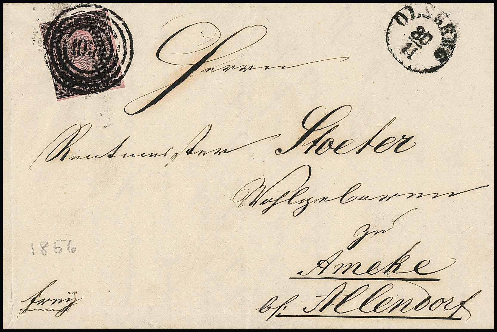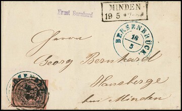 "953" nebst Ra2 "Minden" als kuriose Zweit-Entwertung auf Kabinettbrief mit Hannover 1/30 Th. schw./lachsfarben, diese mit Aufgabe-K2 "Bersenbrück". Aus der Boker-Slg. (Zuschlag DM 1600,-)