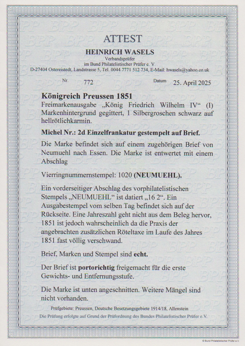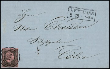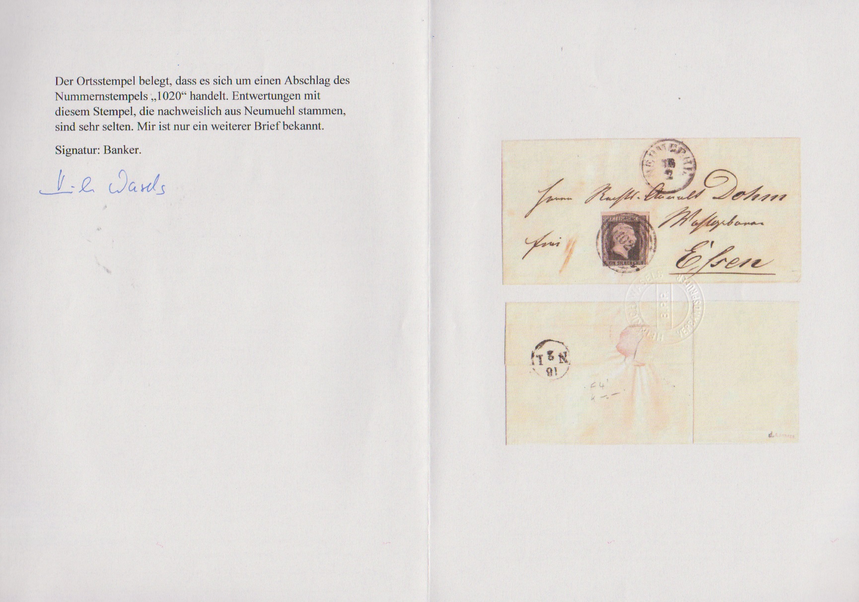 "1020" nebst vorphil. K1 "Neumühl" klar auf Brief 1 Sgr. schw./lilarosa (unten angeschnitten). Auf Brief sehr seltener Rheinland-NS in der 1. Verteilung, nur noch ein weiteres Ganzstück (dieses ex Schneiders) bekannt. Feuser + 4000,-, Attest Wasels