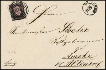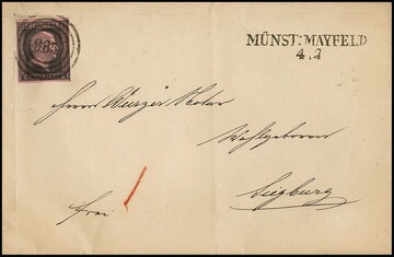 "985" nebst vorphil. L2 "Münst. Mayfeld" klar auf gefaltetem Brief (mit Inhalt 1857) mit Kabinettstück 1 Sgr.