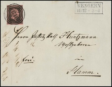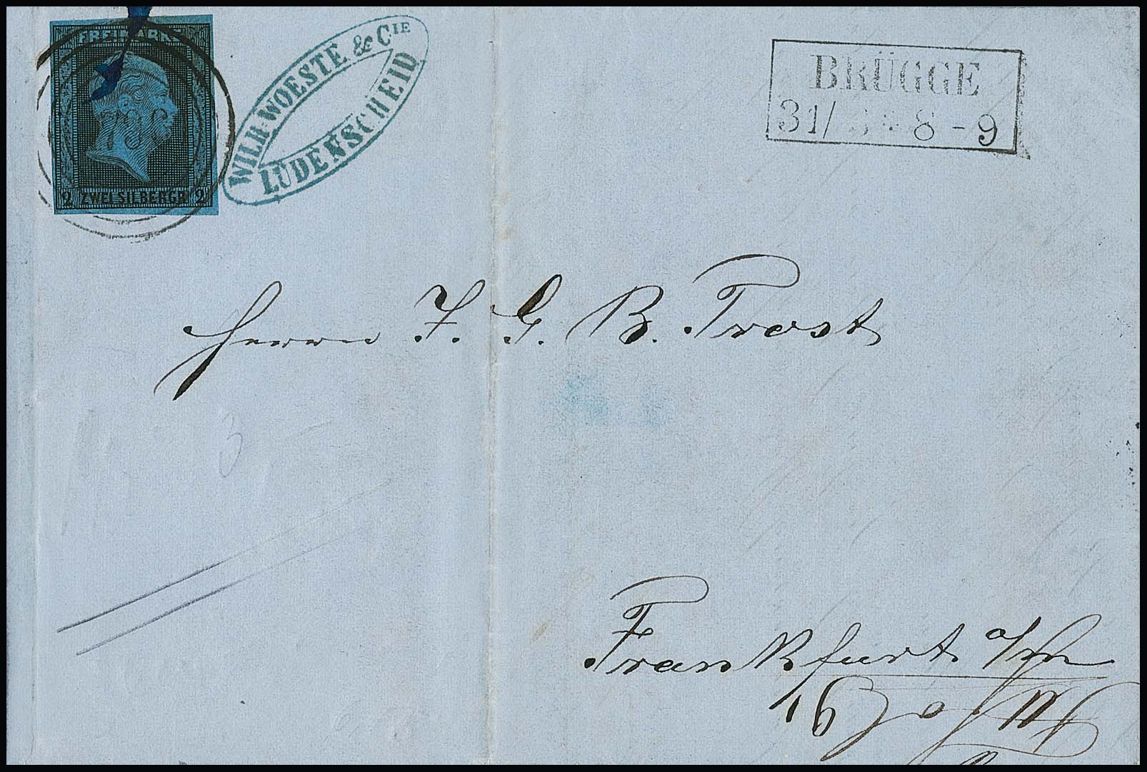 "1796" (und zarte Tintenspur) nebst Ra2 "Brügge" auf Brief (Mittelfalte) mit perfekter 2 Sgr. schw./blau. Der Brief datiert vom 31.3.1859, dem offiziellen Letzttag der Verwendung der Nummernstempel, ein seltener Brief für den Spezialisten, zudem auf Ganzstück guter Westfalen-NS