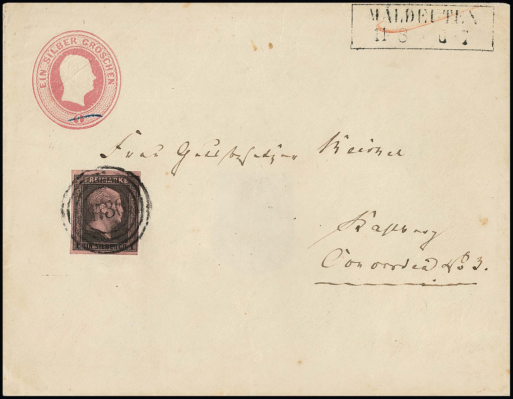 "1730" nebst Ra2 "Maldeuten" klar auf großformatiger Ganzsache 1 Sgr. rosa (leichte Spuren, rs. Siegel entfernt), mit tadelloser 1 Sgr. schw./rosa, gut sign. Meier, Krause, Starauschek. Feuser + 500,-