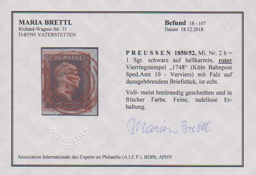 "1748" (Cöln Bahnpost) in rot sehr klar auf Kabinettbriefstück 1 Sgr. schw./rosa (Marke war gelöst und mit Falz replatziert). Fotoexp. Brettl, ex Dale-Lichtenstein