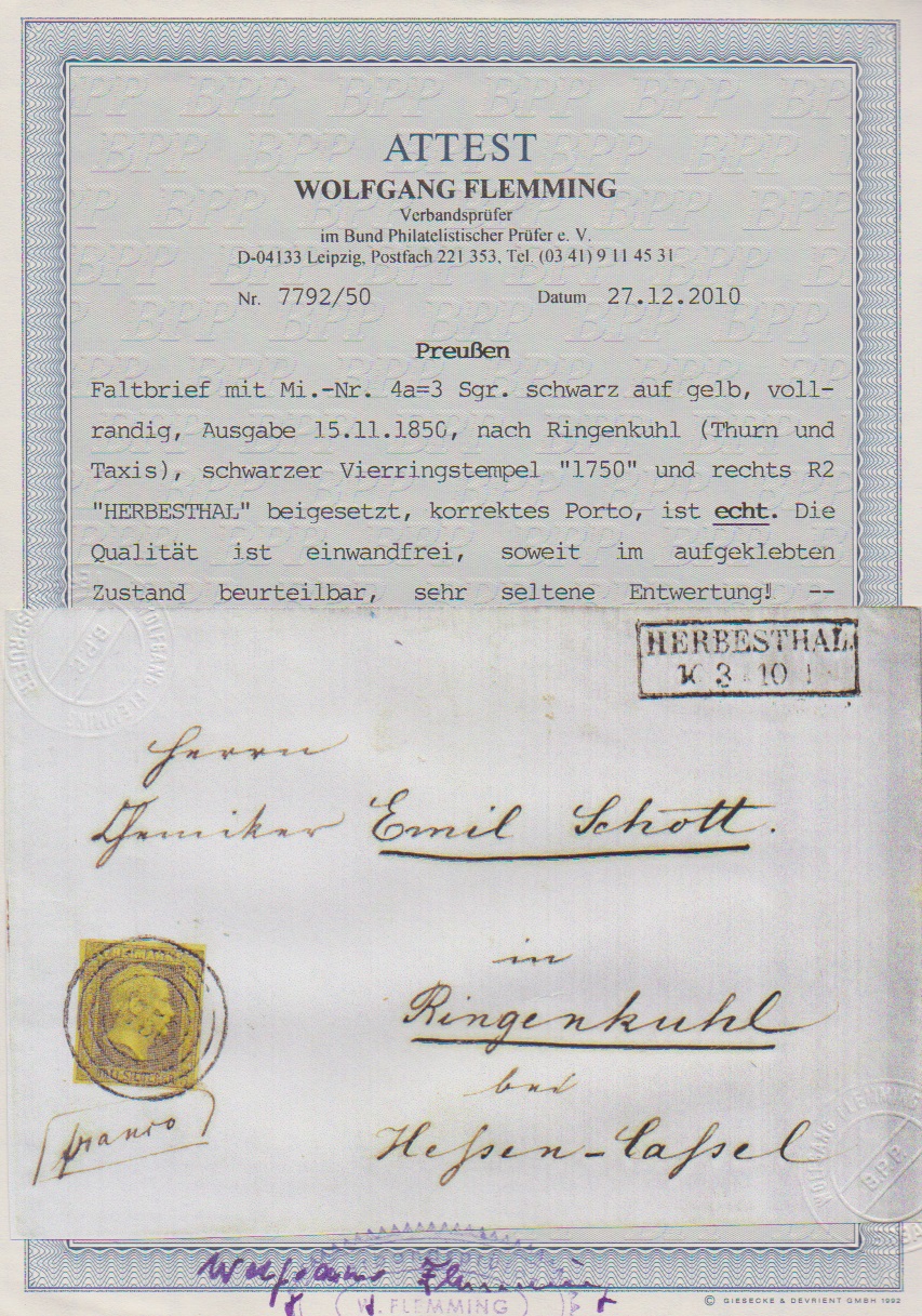 "1750" nebst Ra2 "Herbesthal" klar auf Kabinettbrief 3 Sgr., auf Ganzstück sehr seltener NS aus der OPD Aachen, Feuser + 1200,-