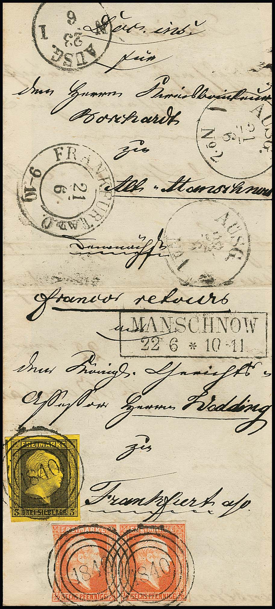 "1840" nebst Ra2 "Manschow" klar auf Vorderseite von Post-Ins.-Doc. mit Paar 1/2 Sgr. (linke Marke links angeschnitten) und 3 Sgr. schw./gelb, lt. Krauß-Handbuch einzig bekanntes Ganzstück dieses Ortes, bei uns registriert seit der 601. Schaub + Brablec-Auktion 1991, sign. Banker