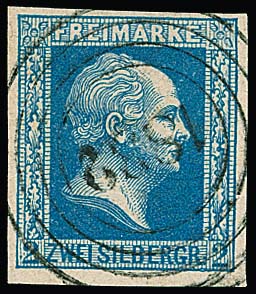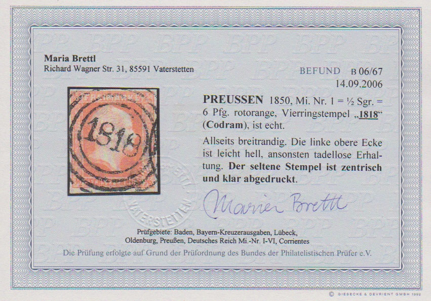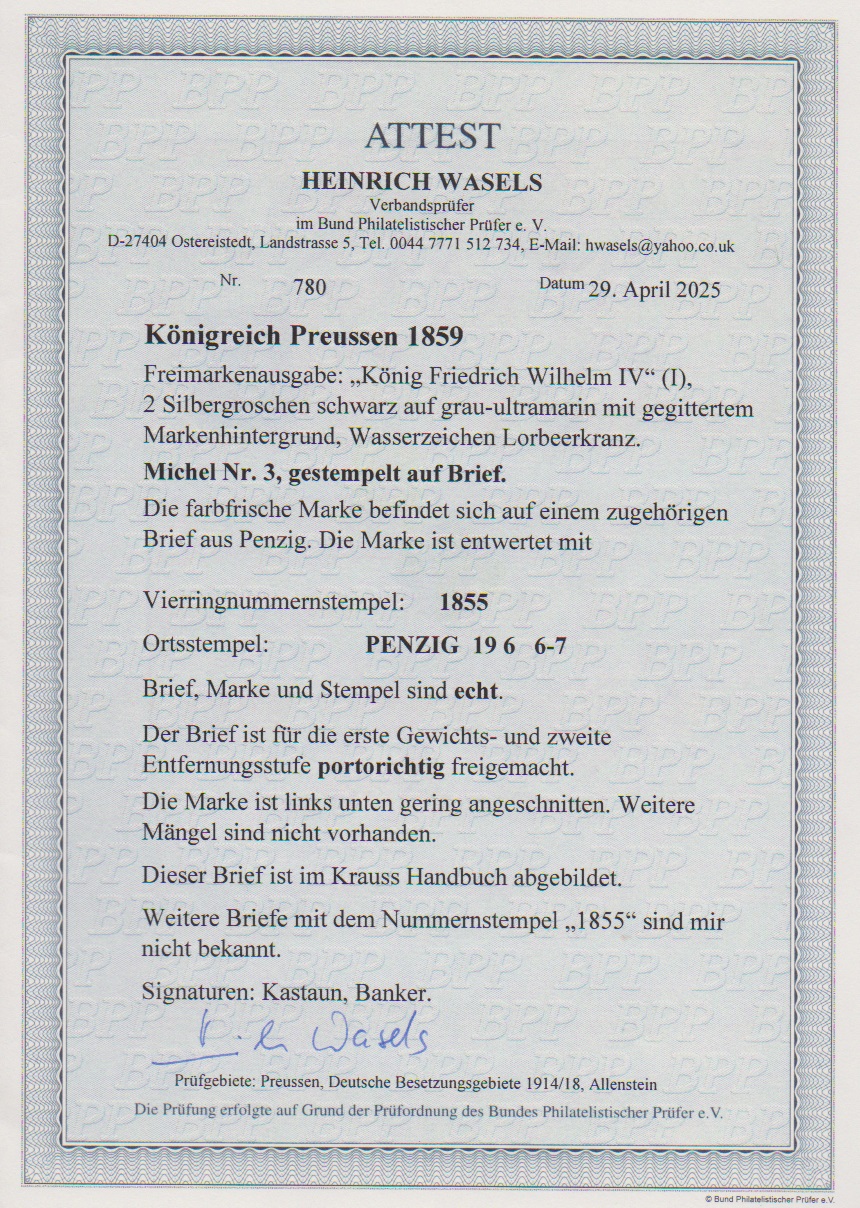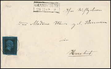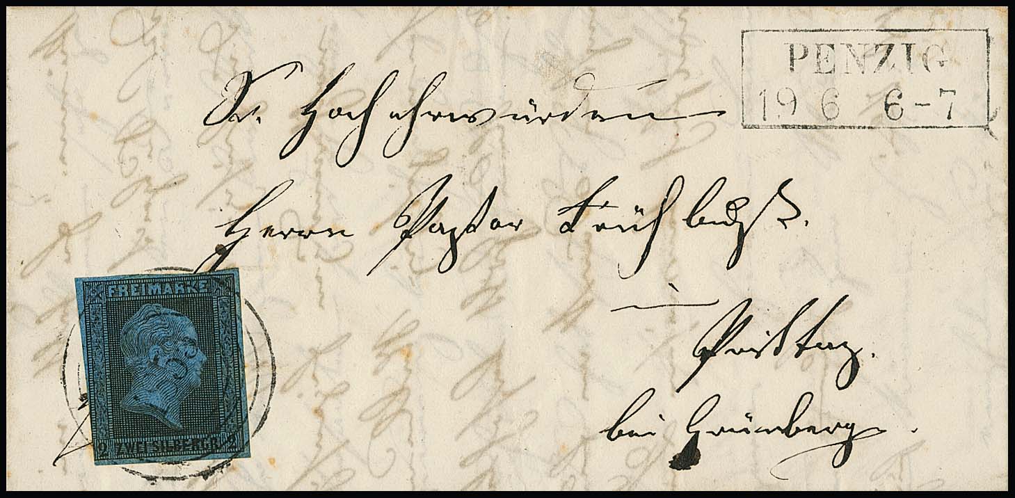 "1855" nebst Ra2 "Penzig" auf Briefchen 2 Sgr. schw./blau (links unten gering berührt). Im Krauß-Handbuch (+ 2000,- Euro) abgebildet als einzig bekannter Brief dieses seltenen Schlesien-Ortes. Attest Wasels, sign. Kastaun, Banker, ex Vahle