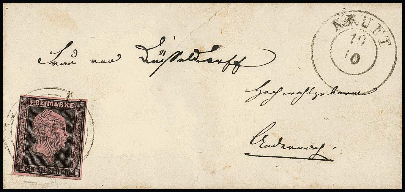 "1841" nebst K2 "Kruft" klar auf Briefchen 1 Sgr. schw./dunkelrosa (oben links winzig Randlinienschnitt). Im Briefpapier unterhalb der Marke kleine und belanglose Fehlstelle, sonst ein schöner Brief des sehr seltenen Nummernstempels aus der OPD Koblenz, laut Handbuch Krauß nur der vorliegende Brief registriert. Feuser + 2000,-