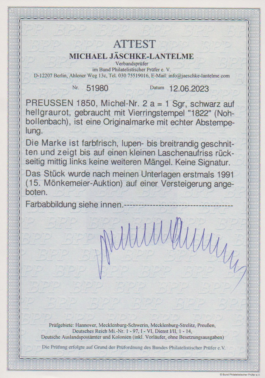 "1822" (Nohbollenbach), seltener Rheinland-NS sehr klar auf tadellos geschnittener 1 Sgr. (rs. winziger Laschenaufriß). Attest Jäschke-L.