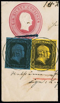 "1811" (Heringen) sehr schön klar auf Luxusbriefstück, 2 Sgr. schw./blau nebst 3 Sgr. schw./gelb auf Ganzsachen-Abschnitt 1 Sgr. rosa, sign. Banker
