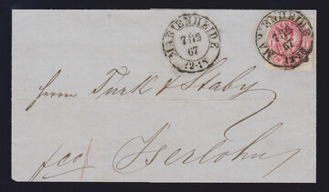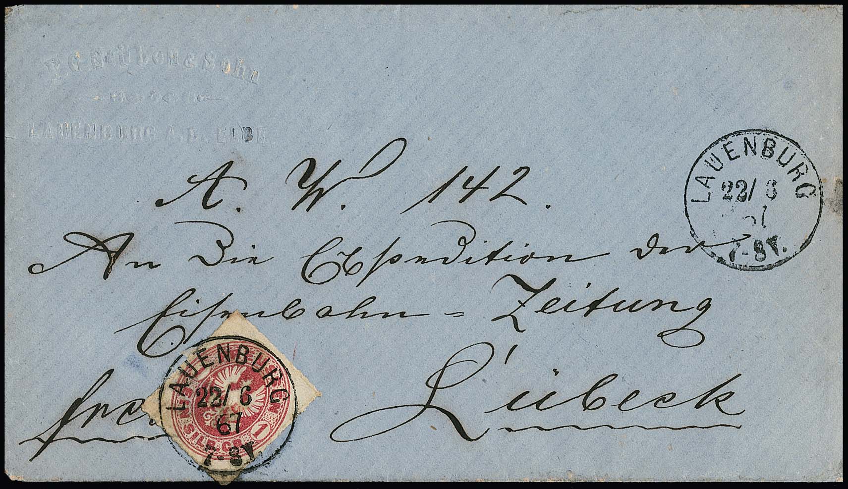 "Lauenburg", seltener neuer Grotesk-K1 klar auf Couvert mit 1 Sgr. rosa (Ecke durch Randklebung etwas stumpf), Attest Flemming