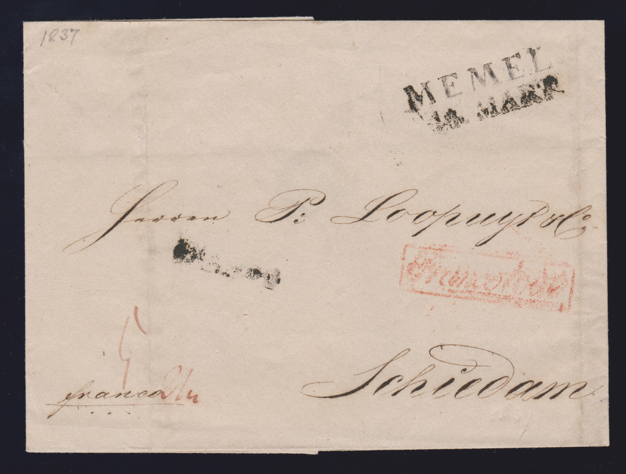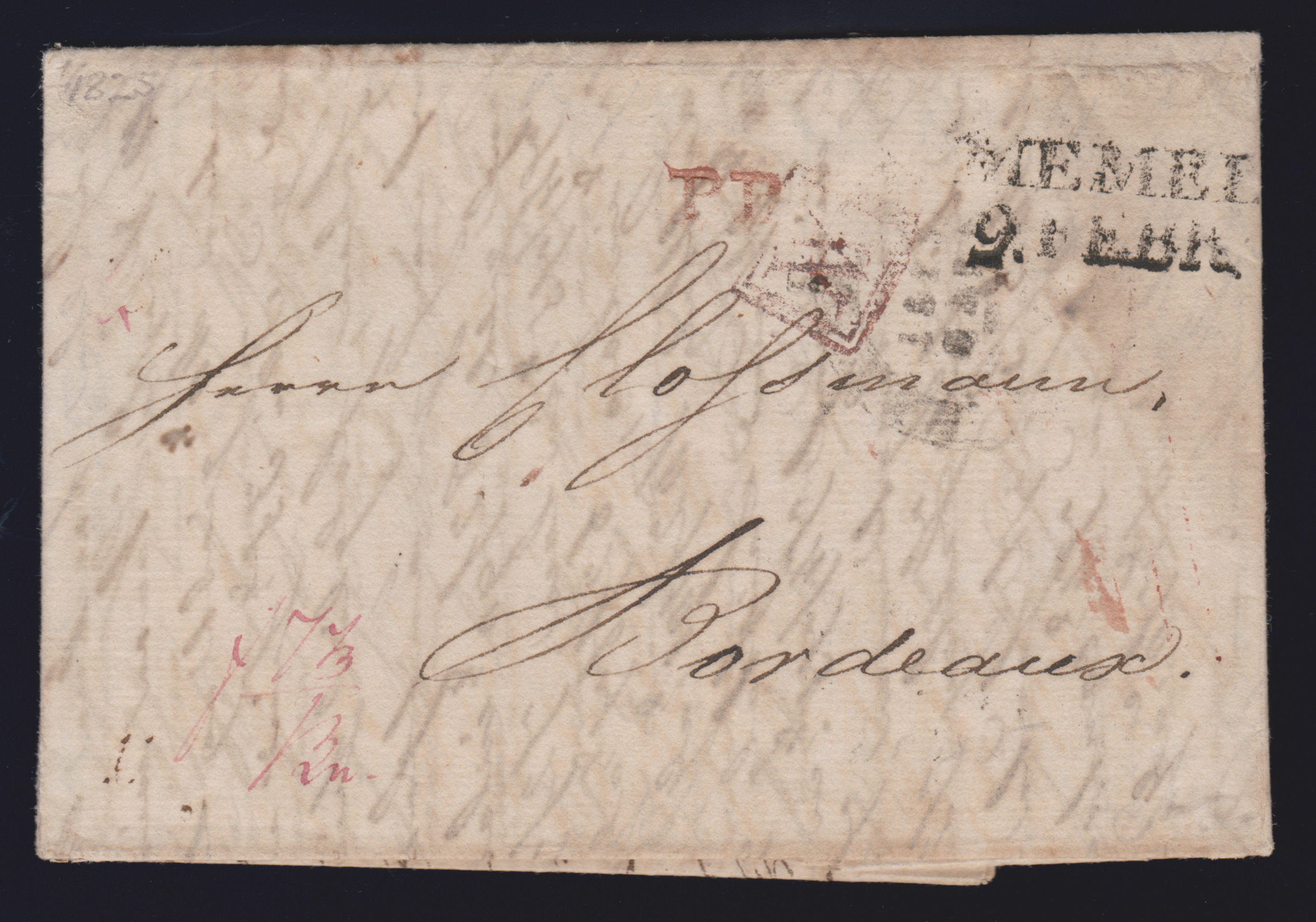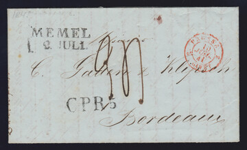 "Memel", 1825-1841, L2 auf drei Auslandsbriefen nach Bordeaux (2) bzw. Schiedam, ersterer aus St. Petersburg