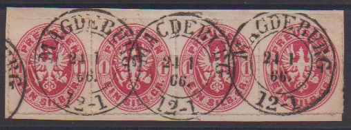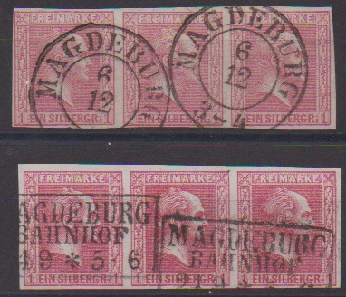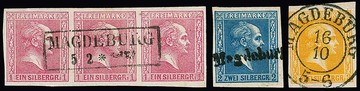 "Magdeburg", seltener Bahnpost-L1 auf Luxusstück 2 Sgr. blau (sign. Brettl), ferner K2 u.a. auf Luxusstück 3 Sgr., Ra2 ideal auf Dreierstreifen 1 Sgr. rosa, Ra3 "Magdeburg Bahnhof" auf Dreierstreifen 1 Sgr. karmin, sowie K2 auf Briefstück mit Viererstreifen Nr. 16
