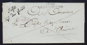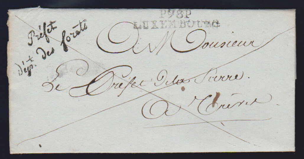 "Luxemburg", 1811, "P.98.P. LUXEMBOURG" und Franchise "PRÉFET DÉP. T. DES FORETS", je L2 auf Prachtbrief nach Trier