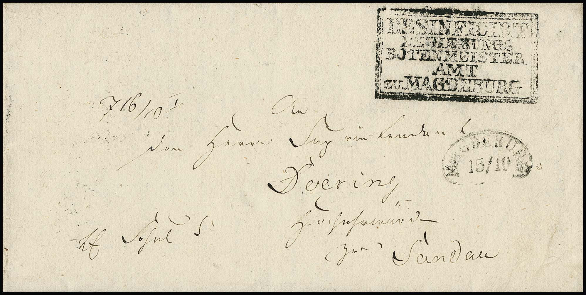 "Magdeburg", 1831, Nierenstempel nebst großem Cholera-Ra5 "DESINFICIRT REGIERUNGS-BOTENMEISTER-AMT ZU MAGDEBURG" auf Kabinettbrief nach Sandau, in so schöner Qualität besonders selten