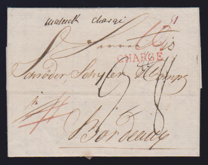 "Magdeburg", 1790, seltener Brief an Schröder & Schyler in Bordeaux mit rotem L1 "Chargé" und hs. "Maseyck Chargé"