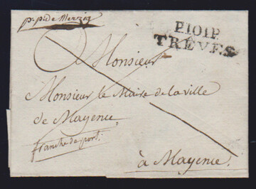 "Merzig", (1805), "P.P. De Merzig" handschriftlich nebst L2 "P.101.P. TREVES" auf kleiner Briefhülle nach Mainz