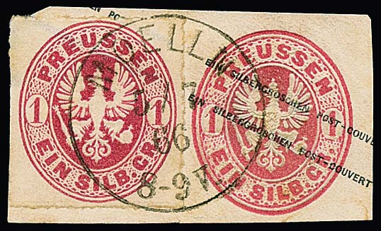 "Moelln", der seltene Grotesk-K1 (früh 5.7.66) sehr klar auf Briefstück (von Ganzsache 1 Sgr.) mit 1 Sgr., links min. Randlinienschnitt