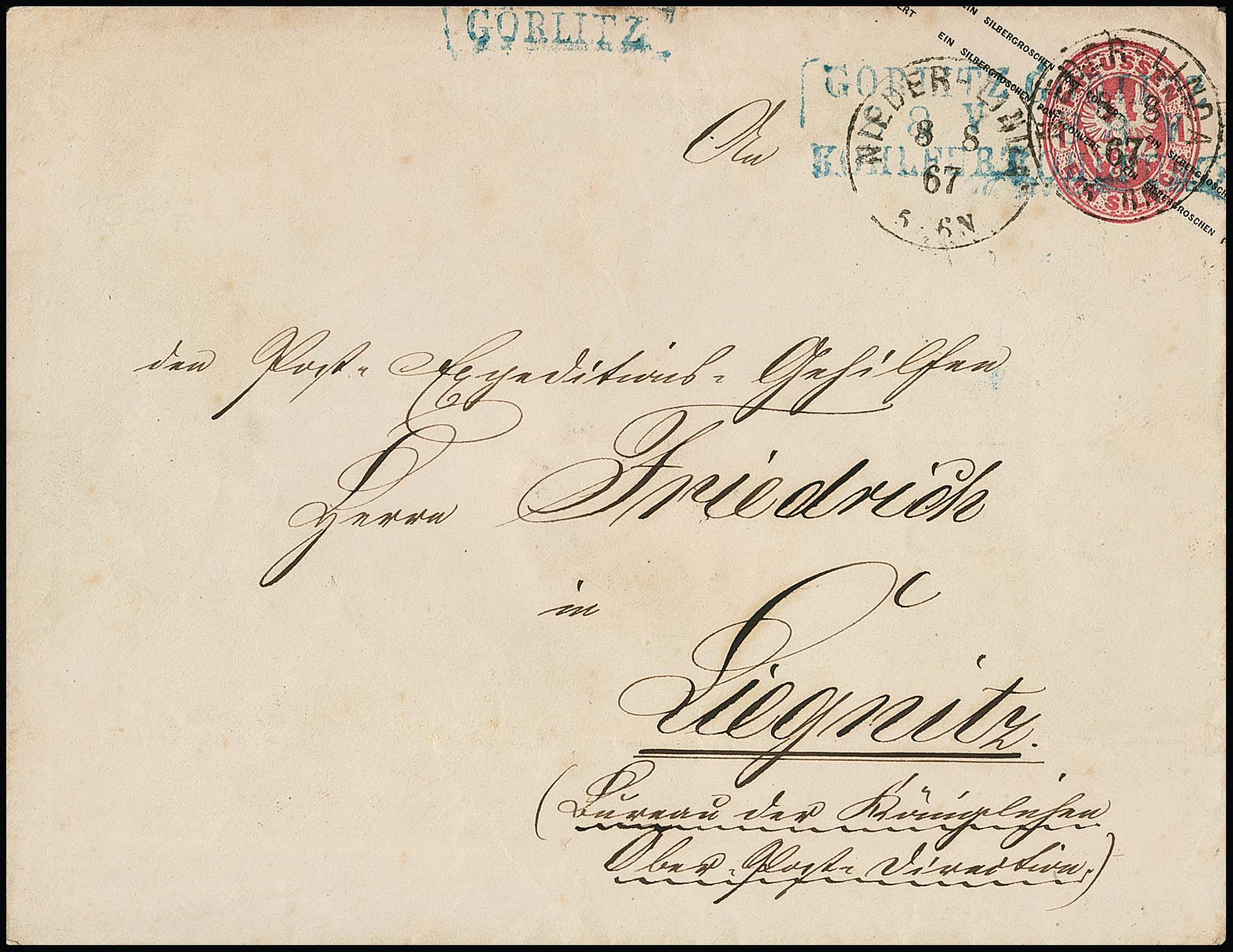 "Nieder-Linda", seltener neuer Schlesien-Grotesk-K1 in Verbindung mit dreifachem (!) blauem Bahnpost-Stempel, L3 "Goerlitz-Kohlfurt" bzw. aptiert nur "Görlitz", vs. auf großformatiger Ganzsache 1 Sgr. 1867, leichte Gebrauchsspuren