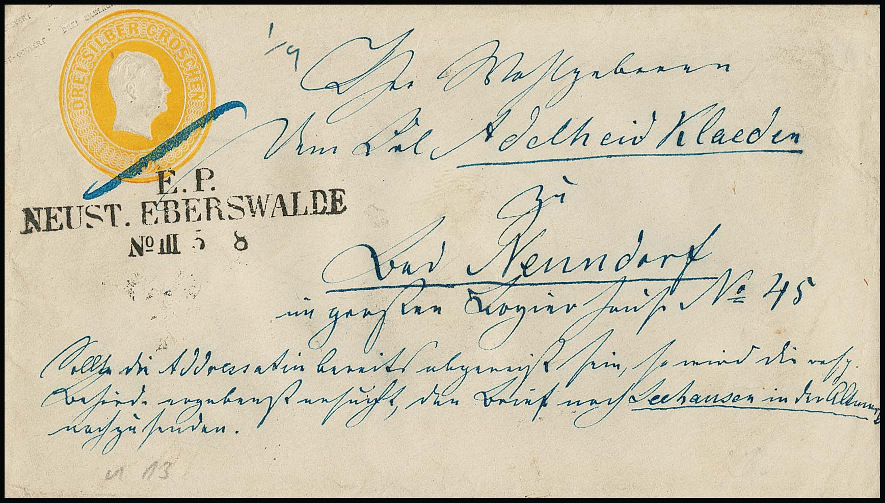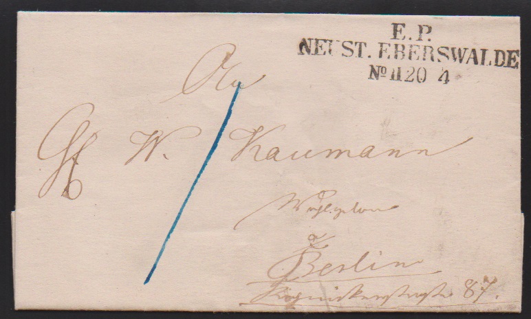 "Neustadt-Eberswalde", je klarer Bahnpost-L3 "E.P. Neust. Eberswalde", Zug-Nr. "No. II" bzw. "No. III", auf Brief 1855, sowie auf Kopf-Ganzsache 3 Sgr. ockerbraun mit interessanter Adressierung